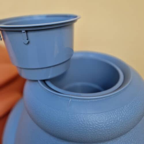 A víz párolgásának csökkentése miatt az esővízgyűjtő saját fedelével lezárható. Az esővízgyűjtő tartály tetejébe egy műanyag ültető kaspó illeszkedik, ebbe virágot vagy más növényt lehet ültetni. A kaspó egy mozdulattal kiemelhető. A jobb menetes csapot egyszerűen csavarja be a tartályba, hogy vizet tudjon kinyerni a vödörbe vagy kannába. Anyaga: UV stabil polietilén műanyag.