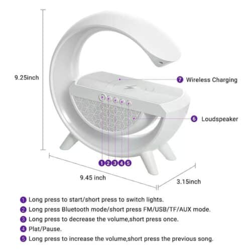 A Zelux ZWCRRGB3W egy multifunkcionális eszköz, amely egyesíti a multimédiás Bluetooth hangszórót, a LED lámpát és a vezeték nélküli töltőpadot. Íme egy részletes leírás a termékről: